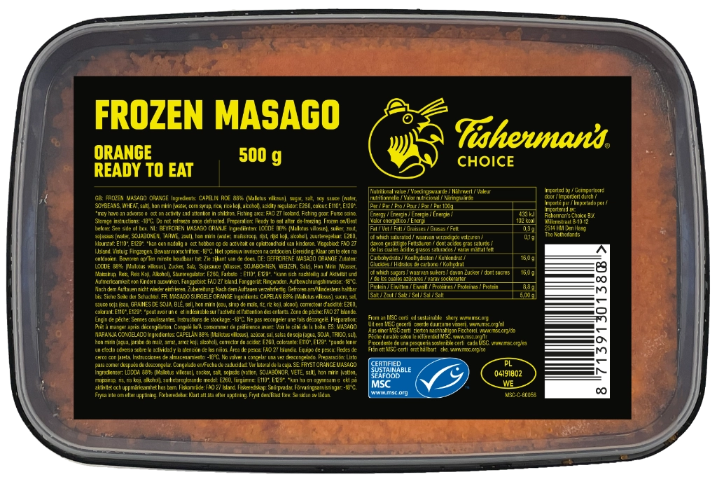 Home Assortiment Sushi & Surimi Masago MSC Masago MSC 12 x 500g Neem contact op Technische specificaties Omschrijving Bereiding Technische specificaties MerkFisherman's ChoiceCertificeringMSCVerpakking12 x 500gBewaaradviesBewaren bij -18°C. Omschrijving Bereiding