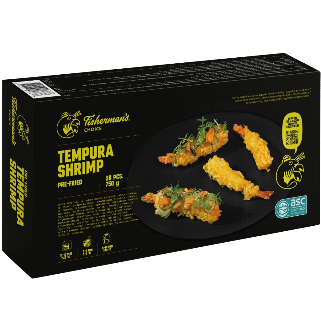 Garnaal met staart, in tempura beslag, voorgebakken, diepvries